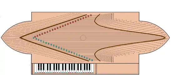 In the oval spinet, the strings were placed parallel to the keyboard, the same arrangement as in a virginals. This can be seen in the following schematic false-color diagram of the 1690 oval spinet, showing the outline, keyboard, bridges, and string arrangement. The diagram and those that follow are colorizations of an original by Tony Chinnery.