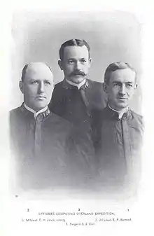 The overland trek left from Cape Vancouver, Alaska on December 16, 1897. The expedition was led by First Lieutenant David H. Jarvis, the executive officer of the Bear; the second-in-command was Second Lieutenant Ellsworth P. Bertholf. They were accompanied by Samuel J. Call, the ship's surgeon of the Bear, and for part of the way by the enlisted man F. Koltchoff. They were also assisted by William Thomas Lopp, the Superintendent of the Teller Reindeer Station, and Charlie Antisarlook, a native reindeer herder. They traveled and carried the provisions using dog sleds, sleds pulled by reindeer, snowshoes, and skis.[2]
