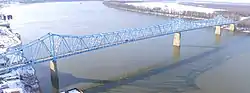 The Owensboro Bridge, also called the Blue Bridge,[2][3] is a continuous truss bridge that spans the Ohio River between Owensboro, Kentucky and Spencer County, Indiana. Dedicated to the memory of the late U.S. Congressman Glover H. Cary (1885–1936) and often called the "Glover Cary Bridge," the bridge opened to traffic in September 1940. It originally was a toll bridge, but tolls were discontinued in 1954. It carried US 231 into Kentucky from Indiana from 1940 to 2002 when 231 was moved onto the newly completed Natcher Bridge. Subsequently its designation was changed to Indiana 161 and Kentucky 2262.[4]