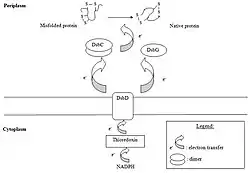 Especially for proteins that contain more than one disulfide bond, it is important that incorrect disulfide bonds become rearranged. This is carried out in the isomerization pathway by the protein DsbC, that acts as a disulfide isomerase. DsbC is a dimer, consisting of two identical 23 kDa subunits and has four cysteine residues in each subunit. One of these cysteines (Cys-98) attacks an incorrect disulfide in a misfolded protein and a mixed disulfide is formed between DsbC and this protein. Next, the attack of a second cysteine residue results in the forming of a more stable disulfide in the refolded protein. This may be a cysteine residue either from the earlier misfolded protein or one from DsbC. In the last case, DsbC becomes oxidized and must be reduced in order to play another catalytic role. There is also a second isomerase that can reorganize incorrect disulfide bonds. This protein is called DsbG and it is also a dimer that serves as a chaperone. To fulfil their role as isomerases, DsbC and DsbG must be kept in a reduced state. This is carried out by DsbD, which must be reduced itself to be functional. Thioredoxin, which itself is reduced by thioredoxin reductase and NADPH, ensures the reduction of the DsbD protein.