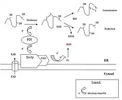 A homolog of DsbA, called protein disulfide isomerase (PDI), is responsible for the formation of the disulfide bonds in unfolded eukaryotic proteins. This protein has two thioredoxine-like active sites, which both contain two cysteine residues. By transferring the disulfide bond between these two cysteine residues onto the folding protein it is responsible for the latter's oxidation. In contrast to bacteria, where the oxidative and isomerization pathways are carried out by different proteins, PDI is also responsible for the reduction and isomerization of the disulfide bonds. For PDI to catalyse the formation of disulfide bonds in unfolded proteins, it must be reoxidized. This is carried out by an ER membrane-associated protein, Ero1p, which is no homolog of DsbB. This Ero1p protein forms a mixed disulfide with PDI, which is resolved by a nucleophilic attack of the second cystein residue in one of the active sites of PDI. As result, oxidized PDI is obtained. Ero1p itself is oxidized by transferring electrons to molecular oxygen. As it is an FAD-binding protein, this transfer of electrons is strongly favoured when Ero1p is bound to FAD. Also a transport system that imports FAD into the ER lumen has been described in eukaryotes. Furthermore, it has been shown that the ability to reduce or rearrange incorrect disulfide bonds in missfolded proteins is provided by the oxidation of reduced glutathione (GSH) to oxidized glutathione (GSSG).