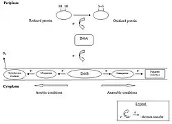 The oxidative pathway relies, just like the isomerization pathway, on a protein relay. The first member of this protein relay is a small periplasmic protein (21 kDa) called DsbA, which has two cysteine residues that must be oxidized for it to be active. When in its oxidized state, the protein is able to form disulfide bonds between cysteine residues in newly synthesized, and yet unfolded proteins by the transfer of its own disulfide bond onto the folding protein. After the transfer of this disulfide bond, DsbA is in a reduced state. For it to act catalytically again, it must be reoxidized. This is made possible by a 21 kDa inner membrane protein, called DsbB, which has two pairs of cysteine residues. A mixed disulfide is formed between a cysteine residue of DsbB and one of DsbA. Eventually, this cross-link between the two proteins is broken by a nucleophilic attack of the second cystein residue in the DsbA active site. On his turn, DsbB is reoxidized by transferring electrons to oxidized ubiquinone, which passes them to cytochrome oxidases, which finally reduce oxygen; this is in aerobic conditions. As molecular oxygen serves as the terminal electron acceptor in aerobic conditions, oxidative folding is conveniently coupled to it through the respiratory chain. In anaerobic conditions however, DsbB passes its electrons to menaquinone, followed by a transfer of electrons to fumarate reductase or nitrate reductase.