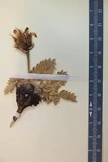 Oxytropis urumovii is distinctive compared to the other Balkan species of Oxytropis, with a semi-bilocular or almost completely bilocular legume. The plant, including the fruit, is densely covered with 2–3 mm patent whitish hairs. Amongst the European species of Oxytropis, Oxytropis urumovii is diagnosed by being acaulescent, having leaves with about eight pairs of leaflets, calyx-teeth which are much shorter than the tube, yellowish flowers and an ovoid semi-bilocular legume.[2] It is distinguished from the more widespread Oxytropis campestris, with which it shares the same habitat, by the much longer, denser and generally patent indumentum.[2]