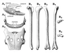 Other anatomical characteristics may have supported gliding in sharovipterygids. The holotype of Sharovipteryx does not preserve forelimbs. Both Gans and colleagues and Dyke and colleagues hypothesized that the forelimbs may have supported an additional pair of membranes, which would have served as a canard wing to improve control and balance the pitching moment of the hindlimb wings.[11][21] Dzik and Sulej noted that the structure of the scapulocoracoid in Ozimek would prevent flapping flight, and that they were at best used for gliding. They also noted that the vertebral bodies and long bones of Ozimek were hollow, but did not have external openings for air sacs that would allow air to fill them; these spaces may have been filled with fat instead, but either way they would have lightened the skeletal structure of Ozimek.[2]