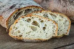 Pão de Mafra is made with a blend of T80 wheat flour and T170 rye flour, water, yeast, and salt.[7] Compared to other breads, it has less yeast and a higher level of hydration, normally above 80%. Although it undergoes bulk fermention and a second proofing after shaping, it generally has a shorter fermentation time.[3] It is often baked in a traditional masonry wood oven with steam.[8] The result is a slightly sweet bread with low acidity, a crisp, tough crust, and a varying, open crumb structure.[9] The humidity of a finished loaf is between 32% to 40%.[1] It is comparable to ciabatta of Italy.[10]
