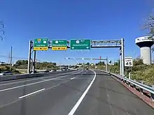 On January 9, 1960, the PDH awarded a contract worth $1,488,493 to James D. Morrisey, Inc. to upgrade the section of PA 132 between Neshaminy and Warminster to a four-lane divided highway.[17] In November 1961, the portion of Street Road southeast of US 13 was closed to allow for construction of I-95 (Delaware Expressway), which would include an interchange with Street Road; this interchange was planned to be completed in 1962.[18] In January 1962, a proposal was made to split PA 132 onto separate roadways through Feasterville, with the westbound direction using Irving Place a block north of Street Road.[19] In January 1963, plans were made to widen the entire length of PA 132 to 80 feet (24 m) with a median strip, with a portion in Feasterville to be widened to 71 feet (22 m). The widening was originally planned to be completed in 1965.[20] By March of that year, the widening project was shelved as the state felt they should receive federal funds to fund the project.[21] With the widening shelved, businesses from Feasterville and Southampton along with State Senator Marvin Keller led a push to get the portion of Street Road through the two communities paved, which was in disrepair and saw a lot of accidents.[22]