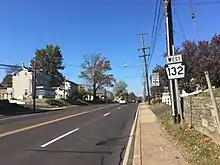 Pennsylvania Route 132 (PA 132) is a state highway in southeast Pennsylvania. The route, which is signed east–west, runs northwest to southeast through Bucks County in suburban Philadelphia from PA 611 in Warrington southeast to Interstate 95 (I-95) in Bensalem. PA 132 is a commercial route lined with shopping centers throughout much of its 15-mile (24 km) length. It is named Street Road and is five lanes wide for much of its length. The route was also designated as the Armed Forces and Veterans Memorial Highway in 2005. From west to east, PA 132 intersects PA 263 and PA 332 in Warminster; PA 232 in Southampton; PA 532 in Feasterville; and U.S. Route 1 (US 1), the Pennsylvania Turnpike (I-276), PA 513, and US 13 in Bensalem. Street Road was included in William Penn's survey plans and completed by 1737. The road was paved by 1911 and received the PA 132 designation between US 611 (now PA 611) and US 13 by 1927. The route was widened into a multilane highway and extended east from US 13 to I-95 by 1970. An interchange with the eastbound direction of the Pennsylvania Turnpike opened in 2010.