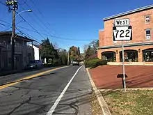 When Pennsylvania first legislated routes in 1911, present-day PA 722 was not given a route number. At this time, the road was paved west of East Petersburg while the road between East Petersburg and Oregon was unpaved.[4] By 1926, the road between East Petersburg and Oregon was paved.[5] PA 722 was designated by 1930 to run from US 230 (Harrisburg Pike) in Bamford east to US 222 and the eastern terminus of PA 772 in Brownstown, heading north on State Road, east on its current alignment to Oregon, and northeast on Oregon Pike.[6] In the 1930s, the eastern terminus of the route was cut back to US 222 (now PA 272) in Oregon, with US 222 replacing the route between Oregon and Brownstown.[7] The western terminus of PA 722 was cut back to a realigned US 230 in 1949.[8][9] In 1969, the intersection with PA 230 (which replaced US 230, now PA 283) was upgraded to an interchange as part of converting PA 230 to a freeway.[10][11]