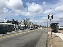 At the Laurel Avenue intersection, PA 73 becomes Cottman Avenue and turns into a three-lane road with one eastbound lane and two westbound lane that forms the border between the city of Philadelphia in Philadelphia County to the northeast and Cheltenham Township in Montgomery County to the southwest, coming to the entrance to the Fox Chase Cancer Center to the northeast of the road. The route passes between Burholme Park in Philadelphia and homes in Cheltenham Township. The road passes more homes and fully enters Philadelphia upon passing under SEPTA's Fox Chase Line south of the Ryers station in the Ryers neighborhood. PA 73 heads into Northeast Philadelphia and becomes a four-lane road as it runs through commercial areas, reaching a bridge over CSX's Trenton Subdivision railroad line.[4][7] The route intersects Rising Sun Avenue and PA 232 (Oxford Avenue) at a junction locally known as Five Points.[4][7][8] The road heads past a mix of homes and businesses, running between the Burholme neighborhood to the northeast and the Lawncrest neighborhood to the southwest. After crossing Algon Avenue, the route passes to the southwest of Northeast High School. PA 73 gains a center left-turn lane and crosses Castor Avenue near the Rhawnhurst neighborhood. The route continues past several shopping centers and intersects Bustleton Avenue, at which point it passes southwest of Roosevelt Mall. PA 73 comes to an interchange with US 1 (Roosevelt Boulevard), intersecting the local lanes at-grade and passing over the express lanes.[4][7]