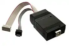 Usually device programmers are connected to a personal computer through a parallel port,[1]: 364 USB port,[11] or LAN interface.[12] A software program on the computer then transfers the data to the programmer,[1]: 364 [13]: 430 selects the device and interface type, and starts the programming process to read/ write/ erase/ blank the data inside the device.[14][15]