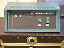 A programmer, device programmer, chip programmer, device burner,[1]: 364 or PROM writer[2] is a piece of electronic equipment that arranges written software or firmware to configure programmable non-volatile integrated circuits, called programmable devices.[3]: 3 The target devices include PROM, EPROM, EEPROM, Flash memory, eMMC, MRAM, FeRAM, NVRAM, PLDs, PLAs, PALs, GALs, CPLDs, FPGAs, and microcontrollers.