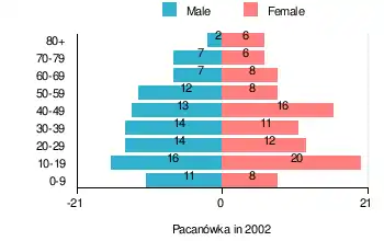 According to the 2002 Poland census, there were 191 people residing in Pacanówka village, of whom 50.3% were male and 49.7% were female. In the village, the population was spread out, with 24.1% under the age of 18, 37.2% from 18 to 44, 23% from 45 to 64, and 15.7% who were 65 years of age or older.[1]