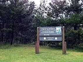 Pacific Pines State Park is a 10-acre (4.0 ha) Washington state park on the Long Beach Peninsula, just north of Ocean Park. From the main parking area, there is a narrow, sandy footpath that leads through a grove of Pacific Ponderosa pine trees to the beach. The park offers picnicking, beachcombing, fishing, clamming, and crabbing.[2]