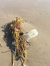 During periods throughout the summer months there may be a large amount of Sargassum, a brown seaweed, which washes up on the shore which aids in shore development by acting to hold sand in place, which can eventually build up the shoreline. Currents within the Gulf of Mexico are responsible for the transport of this seaweed mainly from the Sargasso Sea, but have also been responsible for the transport of trash to the shores of the park. This trash can be anything that is tossed overboard into the Gulf of Mexico as well as items that are either washed into the Gulf from land, or from the interior of the country by means of sewers that empty into the Gulf. These items can range from tiny pieces of plastic, hypodermic needles, and lumber, to nets or bleach bottles tossed overboard by shrimpers and even objects as large as buoys and steel containers. An international treaty known as MARPOL is designed to limit the dumping of wastes into the Gulf[12] but there can be violators and the enforcement of the treaty is difficult, as well as the fact that some trash can originate from sewage transport or even come from the Equator.[13] Oil and tar can commonly wash up onto the beaches as well, 94% of which originates from oil spills, engine lubrication oil, and tanker washings. The park relies on a "grass roots" policy that encourages park visitors to take out more trash than they bring in. Organization such as the Friends of Padre have removed over 2,000 tons of trash at their yearly Billy Sandifer Big Shell Beach Clean Up the last weekend of February every year.