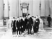 A United States Senate page (Senate page or simply page) is a high-school age teen serving the United States Senate in Washington, D.C. Pages are nominated by senators, usually from their home state, and perform a variety of tasks, such as delivering messages and legislative documents on the Senate floor and the various Capitol Hill offices.[1] Pages are provided housing and attend a special page school at the Daniel Webster Senate Page Residence. Senate pages were first appointed in 1829. Originally limited to boys only, the Senate page program was expanded in 1971 to include girls. There are a maximum of 30 pages assigned to each Senate session, with 16 appointed by the majority party and 14 by the minority. Pages serve senators of the sponsoring senator's party.