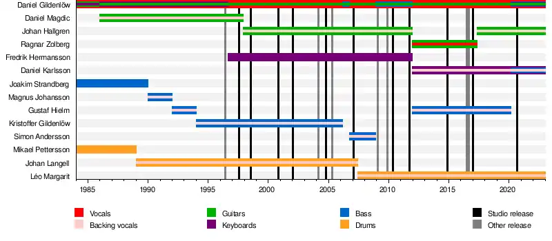 In late 2011 and early 2012, the band's lineup underwent significant turmoil, with Johan Hallgren and Fredrik Hermansson leaving at the end of the year,[24] touring bassist Daniel Karlsson joining the band on keyboards,[25] Gustaf Hielm returning on bass guitar, and Ragnar Zolberg joining on guitars.[26]