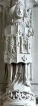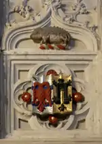 John II Kellond (1635–1692) of Painsford, eldest son and heir, a Member of Parliament for Totnes in March 1679, 1681 and 1685.[54] and Sheriff of Devon in 1683.[55] He refounded the chapel at Painsford in 1687.[56] He married his first cousin Bridget Fownes (born 1641), sister of John Fownes (1640–1670)[57] of Whitley, Devon.[58] His monument survives in Ashprington Church.[59] His eldest son, who predeceased him, was John Kellond (1666–1685) who died unmarried aged 19 at St Mary, Savoy,[60] and was buried in the Church of St Bartholomew-the-Great in the City of London, where his monument survives on the south wall of the choir. His maternal grandparents, Thomas and Hester Fownes, lived in that parish for forty years or more.[61] The monument comprises an oval stone draped tablet with three cherub heads, above which are a heraldic shield displaying the arms of Kellond: Sable a fess and in chief three fleurs-de-lis argent, on the fess a crescent for difference of a second son, and a crest: A demi heraldic tiger salient or maned argent. It is inscribed in Latin as follows: