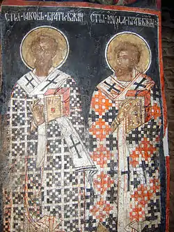 On the first layer were depicted saints who were usually stepped on a high painted plinth, which is one of the characteristic features of the School. Its lines imitated the panel plates of coloured marble. The selection of saints depended on the preferences of the ktitors or on the general theme of the frescoes. Typical feature of the Tarnovo Artistic School are the numerous depictions of warrior-saints. For instance, in the Boyana Church there are ten warrior-saints. Widely spread was the image St Demetrius of Salonica, the patron saint of the Asen dynasty, who was particularly popular in Bulgaria in 13th and 14th centuries. The ktitors were depicted in the narthex of the churches. Portraits of many noble Bulgarians from the Middle Ages have survived throughout the centuries due to that practice. In the Boyana Church are preserved the images of Emperor Constantine Tikh Asen, his wife Irina, sebastokrator Kaloyan and his wife Desislava.[5] There is a beautiful fresco of Emperor Ivan Alexander in the ossuary of the Bachkovo Monastery and in the church of Dolna Kamenitsa there are eleven images: despot Michael (son of Michael Shishman) his wife an unknown noble holding a model of the church; his wife and children and two clerics. Images of warrior saints and ktitors were common in the preserved detailed mural paintings on the foundations of the churches in Trapezitsa.[6] These paintings are featured with mild tones and a sense of realism in the rendered portraits and cloths. One of the churches in Trapeztisa was covered with mosaics.[7] The palace church also had some mosaic decoration.[8]