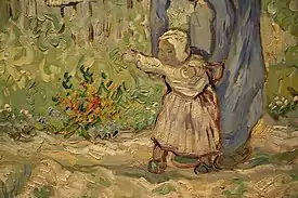 In The Girl in the Woods the girl is overshadowed by the immense oak trees. The painting may be reminiscent for Van Gogh of the times in his youth he fled to the Zundert Woods to escape from his family.[12]
