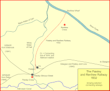 The Paisley and Renfrew railway was an early Scottish railway company that constructed and operated a line between Paisley and the River Clyde at Renfrew Wharf, enabling journeys between Glasgow and Paisley by connecting river boat. The railway was built to the track gauge of 4 ft 6 in (1,372 mm) on stone block sleepers.[1][2]