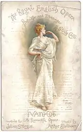 The theatre opened as the Royal English Opera House in January 1891 with Arthur Sullivan's Ivanhoe. No expense was spared to make the production a success, including a double cast and "every imaginable effect of scenic splendour".[2] It ran for 160 performances, but when Ivanhoe finally closed in July, Carte had no new work to replace it, and the opera house had to close. One opera is not enough to sustain an opera house venture. It was, as the critic Herman Klein observed, "the strangest comingling of success and failure ever chronicled in the history of British lyric enterprise!"[3] Sir Henry Wood, who had been répétiteur for the production, recalled in his autobiography that "[if] Carte had had a repertory of six operas instead of only one, I believe he would have established English opera in London for all time. Towards the end of the run of Ivanhoe I was already preparing the Flying Dutchman with Eugène Oudin in the name part. He would have been superb. However, plans were altered and the Dutchman was shelved."[4]