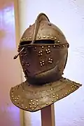Much smaller than the building today (the central part of the extant structure, marked by the use of arches on the balconies, corresponds to Cortés's construction), the original palacio was erected as a fortress, with thick walls, merlons, and other defensive elements, and held its own armory stocked with arquebusses, muskets, cannon, and other weapons. Nevertheless, most of the building was to serve as a residence, supported by mill, stables, gardens, ovens, and more.[4][5] The main body of the palace was erected with two galleries on the west side containing four arches in each of its two levels; living quarters were built on the north and south sides. A watchtower was added when Cortés was named the Captain General and Governor of New Spain .[4] Befitting the conqueror of Mexico and the Marquess of the Valley of Oaxaca, Cortés had his residence furnished and decorated richly; the walls were covered with twenty one tapestries, the chapel contained crosses and other religious items in gold and silver.[6]