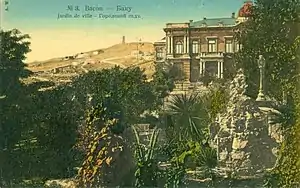 Facade on the side of Niyazi street and specially mentioned and not deep avant-corps which has three axis are divided into two floors with stylobates which are profiled through the whole corps. The central axis is striking with small dome as well. The whole composition of the façade is enriched with lightweight loggia-porticoes of the Ionic order, which is particularly noticeable. This method led to the creation of a composition with landscape. The classic forms of the columns of the visible portico, corinthian order of the avant-corps, the profiles of window frames, and construction of first floor from deep and second floor of lightweight stones creates plastic composition.[7] The palace has unique properties for buildings similar to other building in Baku. In the 1930s, the reconstruction of the land was completed. The volume of the palace was included in the reconstructed garden composition by architect K. İ. Senchikov, which created a whole ensemble.[11]