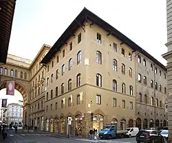 Below are remains of the original structures, as they are in the entrance hall of the palace with ribbed vaults decorated with fourteenth-century motifs, from which the original staircase was accessed. The internal courtyard decorated with graffito is lost.[4] On the left edge of the front on Via degli Strozzi there is a shield (indicated as fifteenth-century, but what we see today is evidently a cast) with the coat of arms of the Anselmi (blue, erased by five pieces of silver). On the corner with Via de' Sassetti is that of the Ristori of the San Giovanni district (golden, with the blue cross set aside by four red roses), placed in 1893.