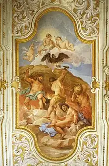 Originally the Renaissance facade had monochrome paintings of the History of Sampson frescoed by Mariano da Pescia. The late 17th century refurbishment coincided with the marriage of Lorenzo Ginori with Anna Maria Minerbetti. Interior roomes were frescoed in 1729 by Alessandro Gherardini, Carlo Marcellini, Giovanni Domenico Ferretti, Vincenzo Meucci, Pietro Dandini and Matteo Bonechi. The work of the latter two in the gallery was redecorated by Pasquale Saviotti in 1847. Further reconstruction at the time coincided with the marriage of Lorenzo Ginori Lisci with Ottavia Strozzi, and under the engineer Felice Francolini, a new monumental staircase was built[2]