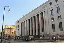 The Palazzo delle Poste or Palazzo Postale is a monumental government building, executed in the stripped classicism architectural style of the 1920s, originally intended as the mail and telegraph center, located on Via Roma #320, in the quarter of Castellamare in Palermo, region of Sicily, Italy. The modern building is bordered on the north by the church of the Sant'Ignazio all'Olivella and the adjacent Regional Archeologic Museum, while Piazza San Domenico is a few blocks to the south.
