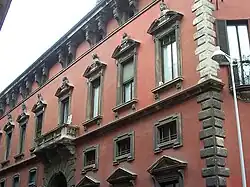 The palace was built between 1589 and 1591 to a design by Giuseppe Meda with the collaboration of Pellegrino Tibaldi.[2] Hardly hit by World War II bombing, only the façade remains of the original building, enclosed by ashlar pilasters:[3] the palace is centred on the ashlar portal, typical of Lombard late Renaissance architecture, surmounted by the Visconti coat of arms and the balcony on the piano nobile; the windows have simple triangular tympanums. On the upper floor we note the curved window pediments with carved busts of the Visconti family of Milan and of Filippo II and Philip III of Spain.[4]