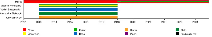 In February 2017 the singer was a guest of Siarhei Budkin’s program "Belsat Music Live", where she acted in a new stage format without a guitar and her musical band.[19] In that year she performed the back vocal part on the Helaiv's song "Anxiety" from the "Too Easy" EP.[20]