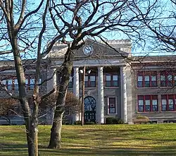 The southern end of Palisade Avenue begins at Newark Avenue, just east of the Hudson County Courthouse, running between the historic Jersey City High School and the 1942 Hudson Gardens Housing project.[10] It soon crosses over Bergen Arches and Long Dock Tunnel, (both of which served the Erie Railroad's Pavonia Terminal) and the Divided Highway (connecting the Pulaski Skyway and the Holland Tunnel).[11] At this point, the avenue enters Jersey City Heights and passes Christ Hospital.[12]