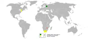 As overall mine production of palladium reached 210,000 kilograms in 2022, Russia was the top producer with 88,000 kilograms, followed by South Africa, Canada, the U.S., and Zimbabwe.[28] Russia's company Norilsk Nickel ranks first among the largest palladium producers globally, accounting for 39% of the world's production.[29]