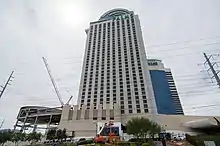 Perini Building Company was chosen as the general contractor, after working on an expansion of the Fiesta in 1999.[13] An official groundbreaking ceremony was held for the Palms on October 24, 2000.[11][16][3] A fire occurred on the lower floors of the hotel tower in April 2001, during construction.[17] The fire, apparently caused by welding, caused $75,000 in minimal damage and would not delay construction.[18] The 42-story hotel tower was topped off on June 7, 2001.[19] It was originally planned as a 40-story building, but the floor count was increased to beat out the nearby Rio hotel, which stood at 41 stories.[16] The project's budget was $265 million, although improvements to a pool and spa courtyard added another $3 million in expenses.[20] The Palms was partially financed with a $55 million credit line,[21][22] from First Security Bank and Wells Fargo.[3]