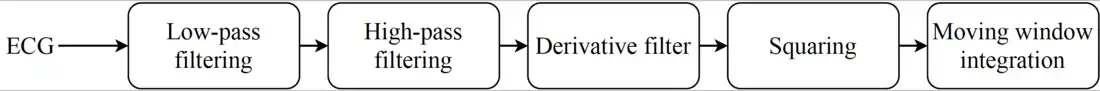As a first step, a band-pass filter is applied to increase the signal-to-noise ratio. A filter bandwidth of 5-15 Hz is suggested to maximize the QRS contribute and reduce muscle noise, baseline wander, powerline interference and the P wave/T wave frequency content.[1] In the original algorithm proposed in 1985, the band-pass filter was obtained with a low-pass filter and a high-pass filter in cascade to reduce the computational cost and allow a real-time detection, while ensuring a 3 dB passband in the 5–12 Hz frequency range, reasonably close to the design goal.