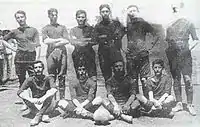 Panathinaikos won undefeated the Championship of 1929–30 under the guidance of József Künsztler and Angelos Messaris as the team's star player.[14] Other notable players of this Belle Époque period of the team were Antonis Migiakis, Diomidis Symeonidis, Mimis Pierrakos and Stefanos Pierrakos, among others. They thrashed rivals Olympiacos 8–2, a result that still remains the biggest win either team has achieved against its rival, with Messaris scoring three goals.[15] The team also defeated Aris 1–4 away in Thessaloniki. Messaris, who scored again three goals, became a hero and chant for the fans.