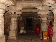 The entire complex is oriented towards the impressive Brahmadeva pillar and faces north. The main central shrine houses the image of Adhinatha, the first Jain tirthankara (Teaching God). The west (right) and east (left) facing shrines have the images of later day tirthankaras, Shantinatha and Neminatha respectively. The images appear to be of well-polished steatite material and could be later day replacements.[1] According to Robert J Del Bonto who conducted research at the site, the two shrines that form the later day additions are a twin construction, are lateral (face each other), have individual vestibule and a closed mantapa (hall) and open into a common open pillared porch (open mantapa). The art critic M.H. Dhaky calls them as "Shantinatha Basadi" and regards them a good example of the "terminal" stage in Western Ganga art.[7] The temple exhibits fine sculptures of Jain Yakshas (male benevolent spirits) and Yakshis (their female counterparts) of the Western Ganga and Hoysala periods.[2][5]