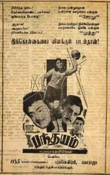Pandhayam (transl. Bet) is a 1967 Indian Tamil-language film produced and directed by A. Kasilingam, who also wrote the screenplay from a story by Madurai Thirumaran. The film stars Gemini Ganesan and Vijaya Nirmala. It was released on 29 September 1967. The film was remade in Hindi as Sachaai (1969) and in Telugu as Manchi Mitrulu.[2]