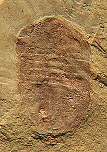 Panlongia was a small-sized (up to 2 cm) marine arthropod, with an oval-shaped non-calcified exoskeleton. Both the head shield (or cephalon) and the tail shield (or pygidium) are semi-circular. In between the cephalon and pygidium are four thoracic body segments (somites). The cephalon occupies approximately ⅓ of the body length, the thorax ¼ and pygidium about 45%. Panlongia lived during the late Lower Cambrian (Botomian) in what is today South China. In Panlongia spinosa the edge of the exoskeleton carries several small sawtooth-like spines, that are absent in P. tetranodusa.[1]