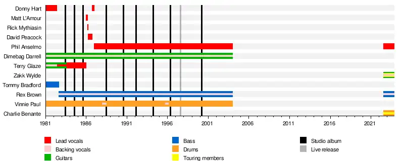 ![]() The band's best-known lineup, circa 2000. From left: Phil Anselmo, Vinnie Paul, Dimebag Darrell, and Rex Brown. | |
