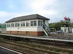 The signal box is located at the southern end of Platform 2 and opened in 1879. When it was first built it was less than half its current length. The original box only contained 26 levers, but the frame was replaced in 1913 when 57 more levers were added. A panel has since been added to control the section through to St Austell and Burngullow as far west as the now closed Probus and Ladock railway station.