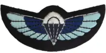 The Parachute Badge with Wings insignia, which depicts an open parachute embroidered in white flanked by a pair of wings embroidered in light blue, is only to be worn by a qualified parachutist who has subsequently been on the posted strength of a unit where they may be ordered in the course of their duties to parachute.[4] Those who do not serve with a parachute unit are permitted to wear the Parachute Badge without Wings, colloquially known as the 'Lightbulb'.[5]