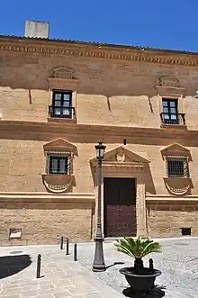 The original building of the Parador de Úbeda was a palace built in the early and mid-sixteenth century for Fernando Ortega y Salido (c.1490—1571), dean of the cathedral of Málaga and head chaplain of the Sacra Capilla de El Salvador de Úbeda, the church next door to the Parador. He wished to have a private residence close to the building of which he was in charge.[4] The palace is believed to have been designed by the architect Andrés de Vandelvira (1509—1575), one of the important architects of the Spanish Renaissance and designer of the cathedral of Jaén as well as many of the main edifices built in Úbeda at that time.[1] The royal architect Luis de Vega (d.1562) is believed to have collaborated in the building's design.[5] It is not known precisely when building work began, but documentary evidence suggests it was during the 1540s. There is a record of welding and carpentry being carried out early in the 1550s.[4] The construction was completed in early in the 1570s. Dean Ortega did not live in the palace as he died in 1571.[4]