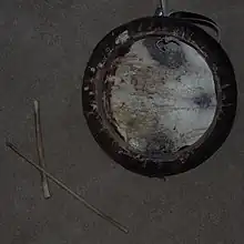 The parai is a traditional Tamil frame drum about 35 centimeters in diameter, used in the parai attam dance. It consists of a shallow ring of wood, covered on one side with a stretched cow hide that is glued to the wooden frame. The preferred wood is neem wood, although other types may be used. The shell is made up of three pieces of wood each in the shape of an arc, held together by three metal plates. The parai is played with two sticks.