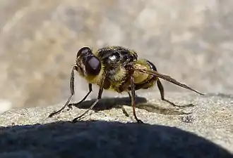 Adults are large flies, and unusual amongst brachyceran flies because they have a dense covering of fine setae (like hairs) and colored patterns that make them appear like bumble-bees (Hymenoptera). All species of the Oestridae are so highly adapted to the myiasis type of parasitism that the adults do not feed and have only residual mouthparts (see photograph of Hypoderma iparece).[46] All these flies have an obligate myiasis life-cycle, with a complete metamorphosis.[1][47] The females lay eggs with high selectivity on their special hosts and at specific sites there. For example, eggs laid on the legs of horses in the case of species of Gasterophilus.[48] The horse licks at the irritated skin and the larvae transfer to the mouth of horse. The larvae penetrate tissues in the oral cavity, feed parasitically whilst migrating through tissue of the esophagus to finally reach the stomach. The final larval stage is completed with the larvae attached to the mucosa of the horse's stomach. When ready to pupate the larvae detach and are voided in the horse's feces. Another example is Dermatobia hominis, torsalo-fly, which is an important parasite of cattle, and sometimes humans, in tropical regions of South America.[49][50] The larvae cause a localized, furuncular (= like a boil) myiasis in the skin of their hosts. The larvae infest these sites when transported there accidentally by blood feeding mosquitoes; the adult female Dermatobia flies lay their eggs on the legs of mosquitoes, a dispersal mechanism called phoresy.