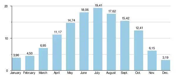 The average temperature over the last five years was 11.1 °C, the yearly precipitation was 1053.6 millimeters. The last years have been exceptionally wet.
