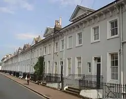 The west and east sides match each other.[19][20] Most houses have two storeys, but some rise to three; all have a basement and a three-window range with sash windows. The entrances are in the rear elevation and are paired under single doorcases with cornices, architraves and fanlights. The windows are topped by similar architraves.[19][20] At the front, facing the garden, the hipped roofs of the main sections have prominent eaves, and the roofs of the tower sections have similar treatment.[19][20] Number 1, at the southwest corner, has ground-floor rustication carried round on to its south-facing wall, and its windows are different.[19] Similarly, number 48—the end house at the southeast corner—has a hipped-roofed south-facing wing with a hipped roof, in which the entrance is set in a doorcase flanked by antae. The corner of the house is chamfered and has a blank two-window range.[20] Several houses in the east side of the crescent have dormer windows in their attic space.[20]