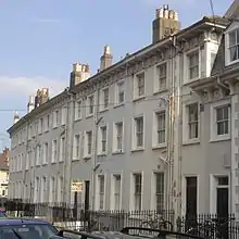 Park Crescent Terrace was built adjacent to the crescent on its west side.[6] Numbers 1 to 16 Park Crescent back on to the terrace. At its south end, a Salvation Army Congress Hall was built in 2000 by David Greenwood of the Salvation Army Architects Department. The new octagonal building, whose gables resemble those on Park Crescent's houses, replaced a 1,400-capacity predecessor of 1883 on the same site.[6][23] Another important local building, demolished in 1930, was the Gaiety Theatre on Park Crescent Place, which runs northwards from Park Crescent to Trinity Street. It was the Royal Hippodrome from 1876 until 1889, and held a popular circus. After a short closure, it reopened in 1890[6] as a theatre specialising in melodrama and music hall performances.[24] It was demolished in 1930 and replaced by flats.[6]