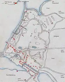 In 1682 Frederick William of Brandenburg, the Great Elector, commissioned the first hunting lodge Jagdschloss Glienicke next to the uninhabited village Klein-Glienicke which suffered badly in the Thirty Years' War. The lodge had a garden with four carp ponds. South of the lodge was an enclosed wildlife park; north a tree garden and two vineyards.[3] Already since 1660 the first wooden Glienicke Bridge linked the area to Potsdam. In 1715 under Frederick William, the Soldier King, the lodge became a military hospital for soldiers to be quarantined. In 1747 the hospital head Dr. Mirow bought the tree garden and the new vineyard which were neglected since the Soldier King's death and established there an estate where besides farming kilns for bricks and lime were operated. In 1758 the lodge itself was turned into a wallpaper factory which became an orphanage in 1827. From 1789 on the Berlin-Potsdam chaussee (de) was built distinctly separating former lodge and new estate. The Mirow estate had different owners until the Prussian lieutenant general and head equerry Count Carl von Lindenau (de) bought it in 1796[4]: 378 and converted it into an ornamented farm.[5]/: 22-